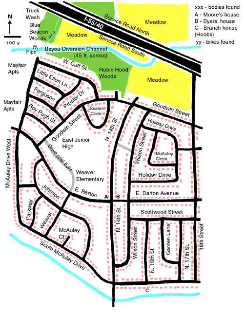 | The Neighborhood Two of the children lived across the street from each other. Michael Moore lived at 1398 E. Barton and Christopher Byers lived at 1400. This, in turn, was next door to their school, Weaver Elementary. Steve Branch lived two long blocks from the others on S. McAuley Dr. They lived in a residential neighborhood three quarters mile south of the Interstate, a three quarters mile east of a warehouse zone. Steve Branch's house backed up against a diversion channel of the bayou (not the same channel near where his body was found). Byers and Moore lived on opposite street corners. Distance from Byers/Moore to Branch house: 680 yards (street), 580 yards (direct).